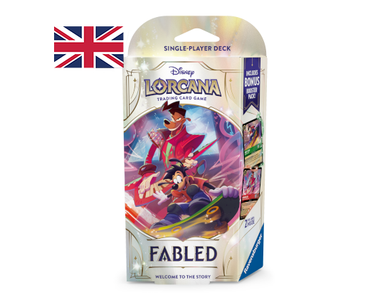 - CONTENUTO: 1 Starter Deck Emerald - Ruby del set Fabled, 1 Booster Pack con 12 carte del set Fabled di Lorcana, 11 segnalini danno, 1 tappetino da gioco in carta 1 inserto con le regole del gioco.