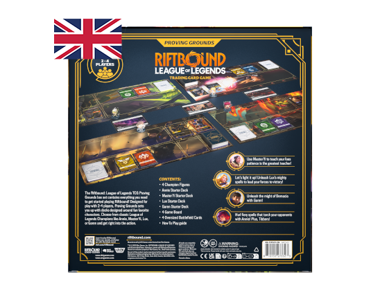 - 4 MAZZI INTRODUTTIVI: Ogni Proving Ground contiene quattro mazzi introduttivi (Annie, Master Yi, Lux, Garen) bilanciati tra di loro per permettere un'esperienza di gioco semplice e coinvolgente.
