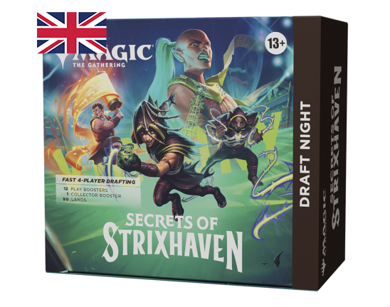 - È UNA SERATA DRAFT IN SCATOLA!: Draft Night è il kit completo per organizzare un draft a due pick per quattro giocatori. Draft veloce e dinamico, ideale per casa o per aggiungere un pizzico di varietà alla serata di gioco! Premia il vincitore con il Collector Booster di Secrets of Strixhaven incluso (o tienilo per te, non ti giudicheremo).