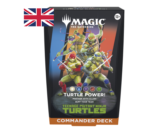 - CONTENUTO: 1 mazzo Commander "Turtle Power" di Magic: The Gathering | Teenage Mutant Ninja Turtles pronto per essere usato (contiene 2 carte leggendarie foil), 1 comandante Display foil-etched in rilievo, 10 pedine bifronte, 1 carta-guida, 1 segnapunti e 1 portamazzo